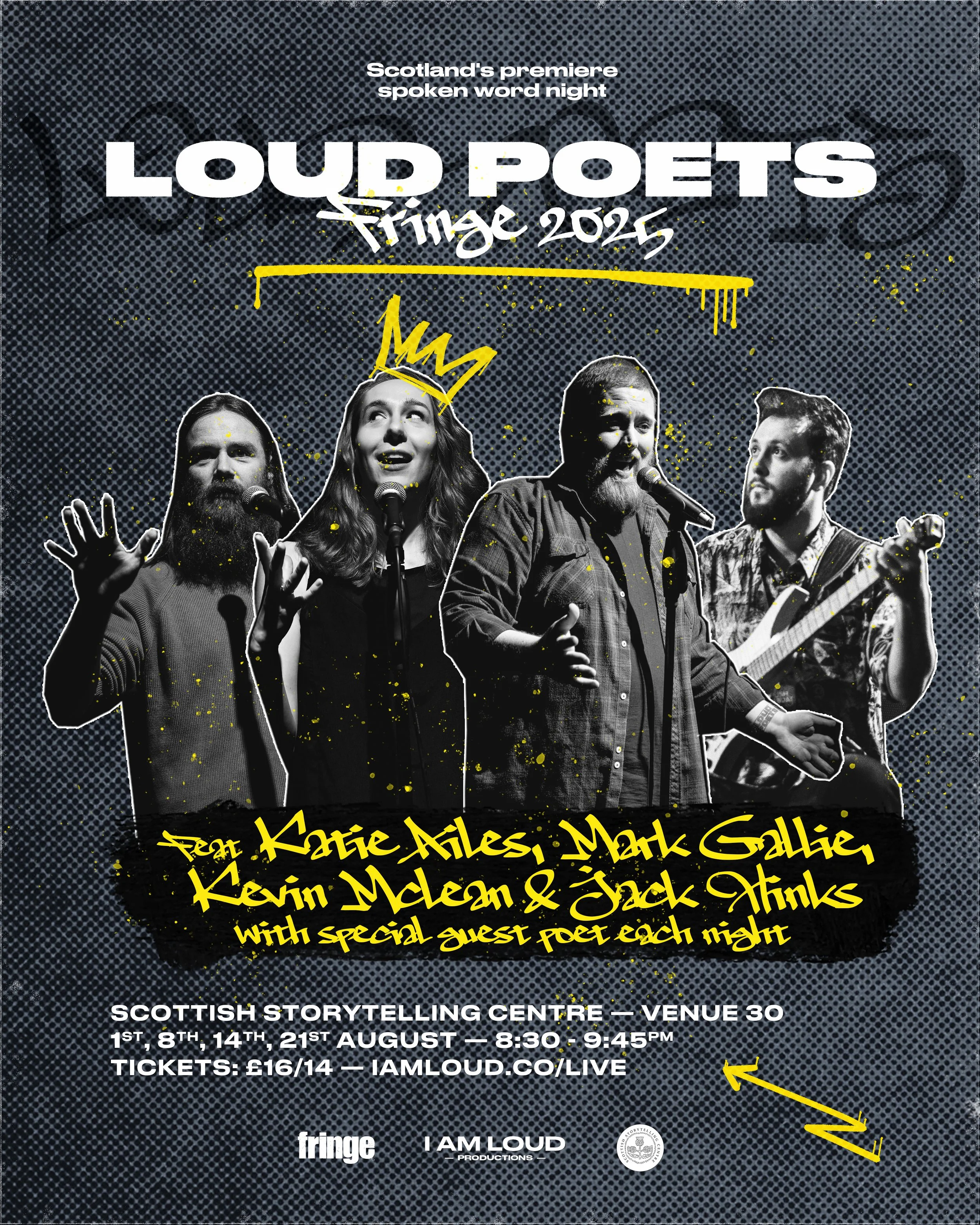 We’re debuting a brand-new show featuring the core Loud Poets Katie Ailes, Mark Gallie, and Kevin Mclean, with musical accompaniment from Jack Hinks and a different guest poet every night! Combining original spoken word, live music, visuals, and some tricks up our sleeves, this show rethinks what poetry can be and do. Expect a fist-thumping, pint-drinking, side-tickling, heart-wrenching spectacle that will thrill poetry lovers and turn sceptics into fans. Let’s get LOUD!