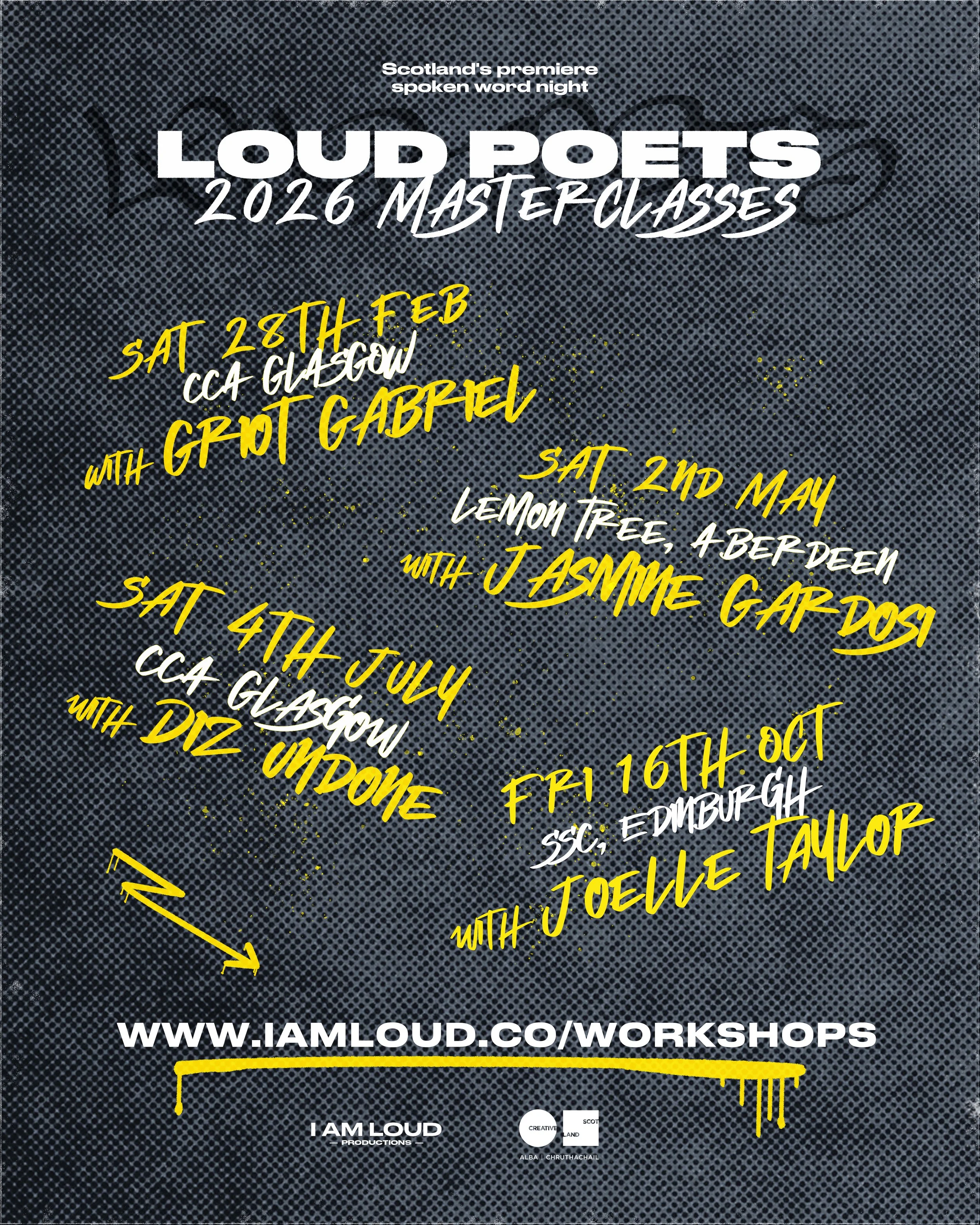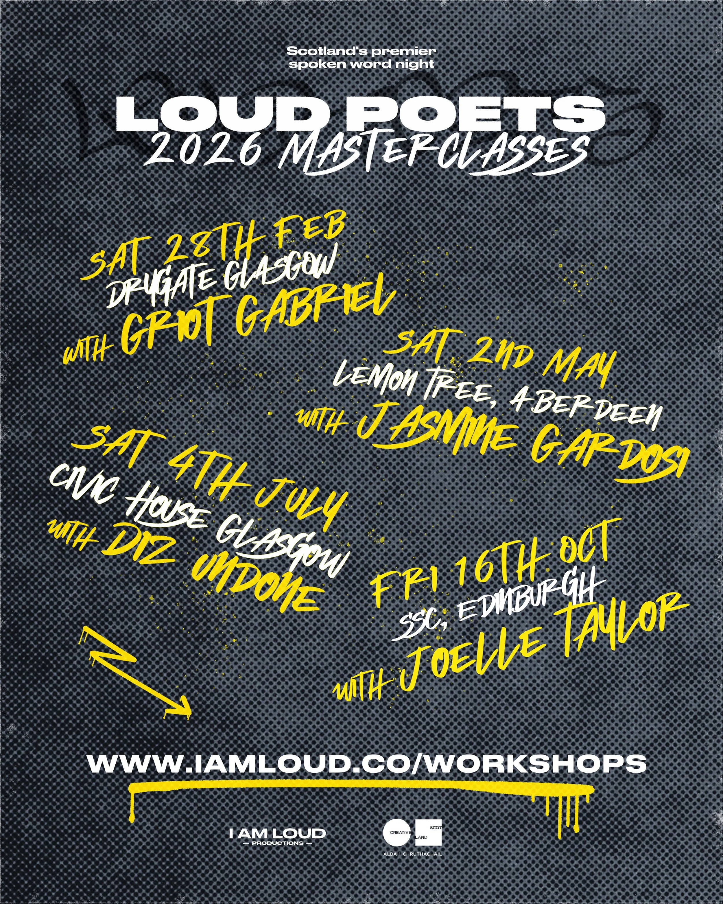 New for 2026, we're hosting masterclasses with some of the UK's top spoken word poets! Don't miss your chance to learn from award-winning artists Griot Gabriel, Jasmine Gardosi, Diz Undone (fka Dizraeli), and Joelle Taylor. Each poet will be delivering a bespoke in-person masterclass on an element of creative writing or performance of their choosing. These will be intimate sessions limited to 20 participants, so we advise booking quickly. Save the dates below, and stay tuned for masterclass themes, ticket links, and further information coming soon!